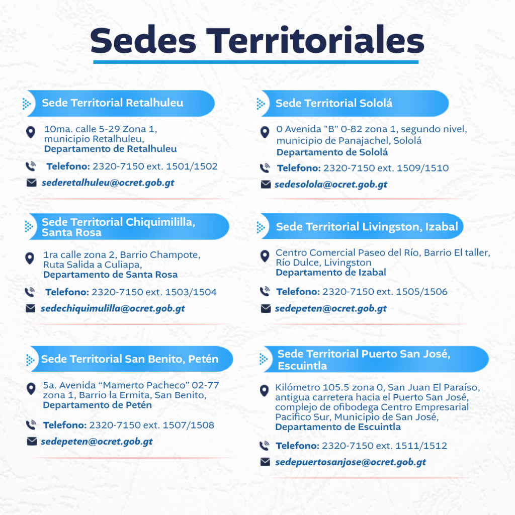 Si quieres enviar un correo a OCRET de tipo oficial, puedes llenar este formulario o envíanos un correo a interinstitucional@ocret.gob.gt
